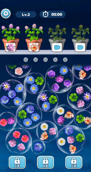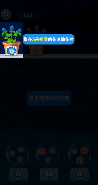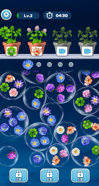 游戏核心目标是收集3朵相同花朵填满对应花盆”。进入关卡后,请紧盯界面顶部显示的当前花盆需求,优先点击气泡中匹配的花元素进行填充。例如,当任务要求粉色花朵时,应集中点击粉色花气泡,快速完成该花盆任务以推进进度。
