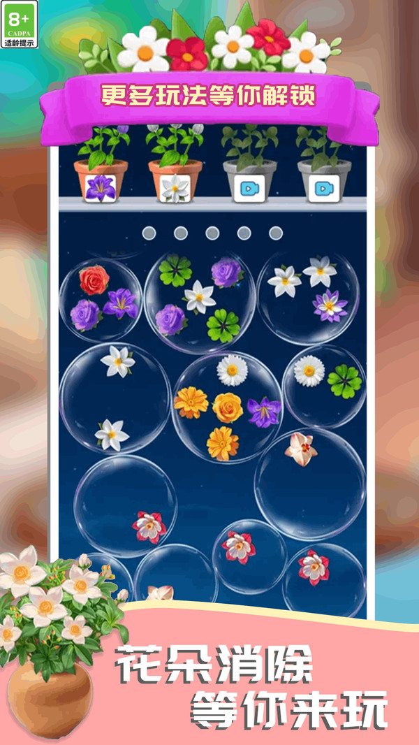 游戏以缤纷花卉为核心消除元素,搭配柔和色彩与卡通风格美术设计,营造出极具疗愈感的视觉氛围。每一次滑动与消除都如同在花园中漫步,不仅带来流畅的操作快感,更在不知不觉中缓解压力,让玩家在轻松愉悦中享受游戏时光。