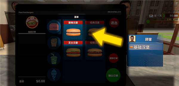 1、进入快餐革命游戏后,首先操控角色来到点单台,等待顾客上前点餐。当有客人提出需求时,点击收银电脑进入点单界面。