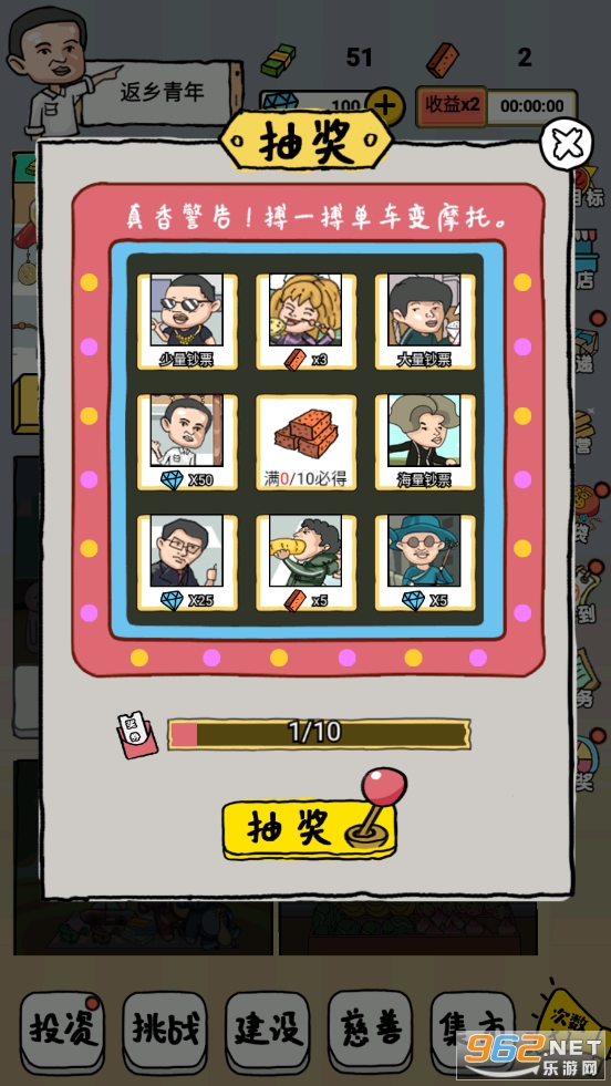 本游戏是一款摆地摊模拟经营类游戏,游戏主要功能有模拟经营,基地建设、经营投资、关卡挑战等,更多的趣味玩法,等你来挑战哦!