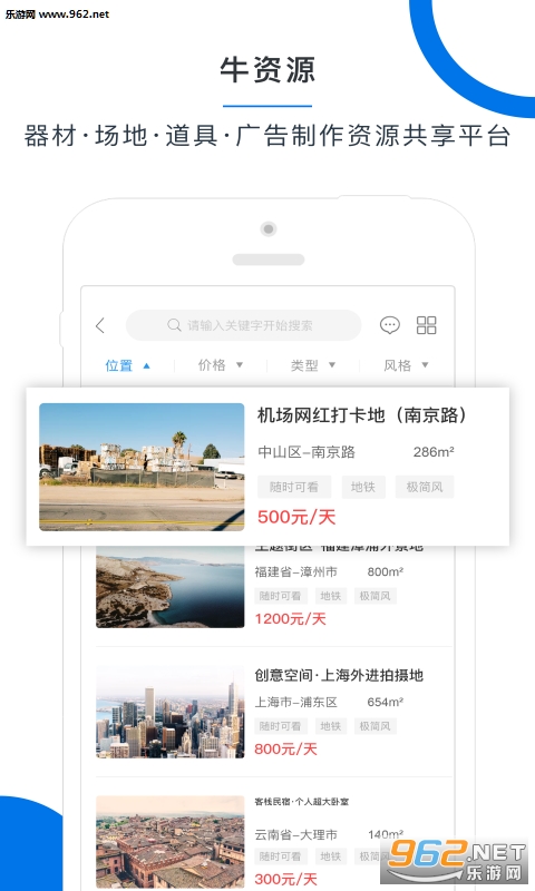 牛资源板块是一个资源共享平台,汇集广告行业上万各类优质制片资源,包括拍摄场景,会议场地,活动场地等,让商家资源得以充分利用,找资源,再也不用满深圳跑啦!