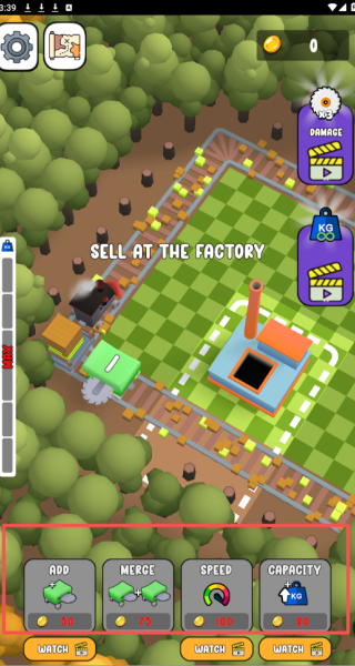 出售木材后获得金币,可用于升级伐木车的关键性能,包括移动速度、载货容量等,显著提升整体运营效率。
