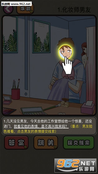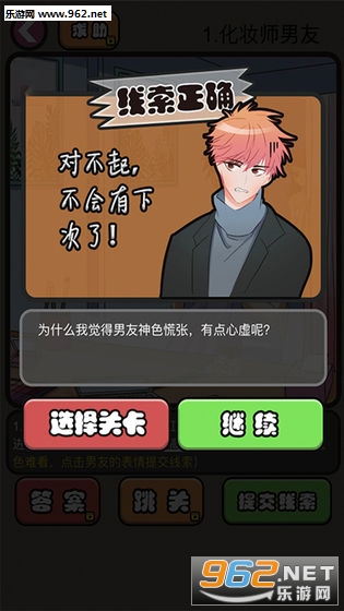 玩家通过阅读剧情文字,找到渣男渣女出轨的线索,提交正确线索,推动剧情发展,顺利通关!