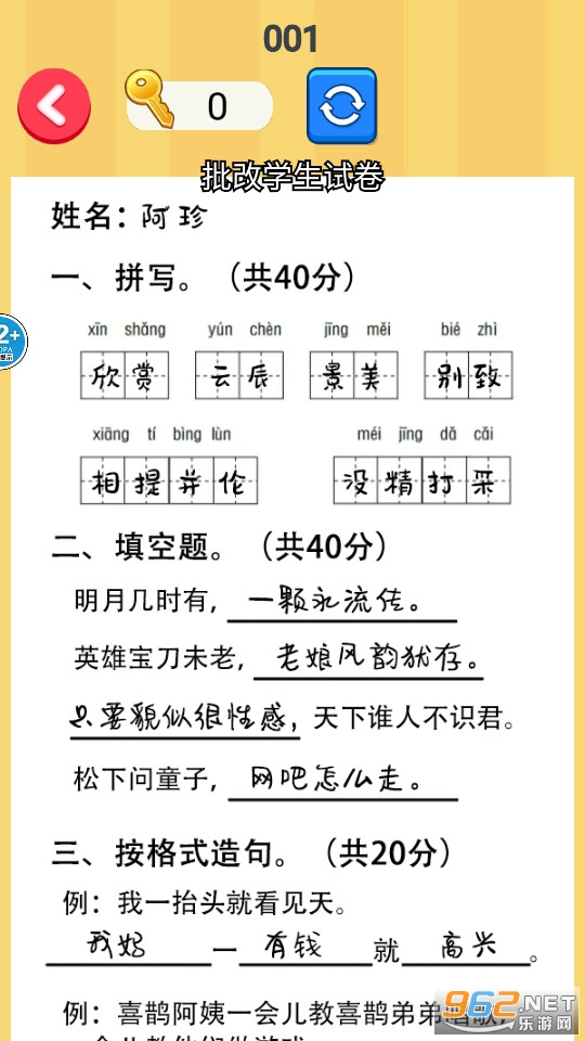《老师改作业》是一款非常有趣的闯关冒险游戏,为大家准备了丰富的关卡,玩法内容丰富,有很多有意思的元素,上手简单,适合各个年龄向的玩家,仔细的进行批改,模拟真实的审卷体验,快来下载挑战吧!