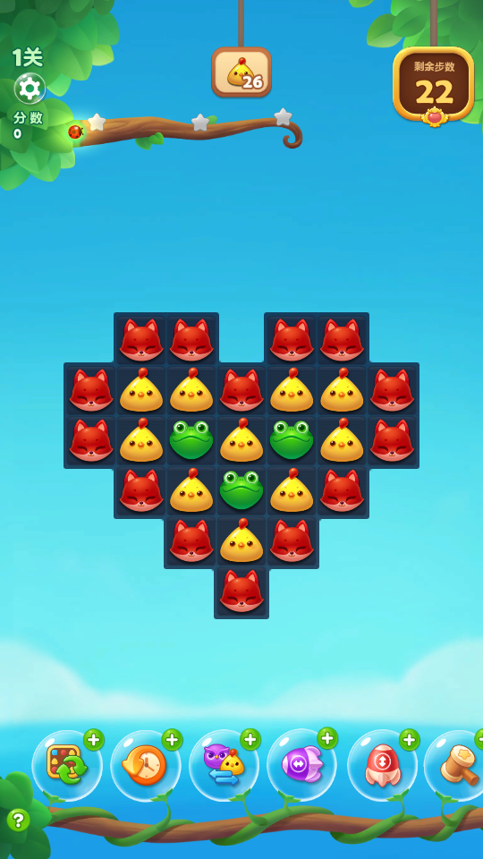 基本规则为:将三个或以上相同颜色的小动物连成直线(横或竖)即可消除。关卡目标多样,包括获取指定分数、消除特定元素、收集金豆荚、清理云朵区域等。游戏设有普通关卡与隐藏关卡两类——普通关卡每15关组成一个区域,需累积足够星星才能解锁下一区域;隐藏关卡则需在对应普通关卡中获得三星评价方可开启,难度更高、奖励更丰。