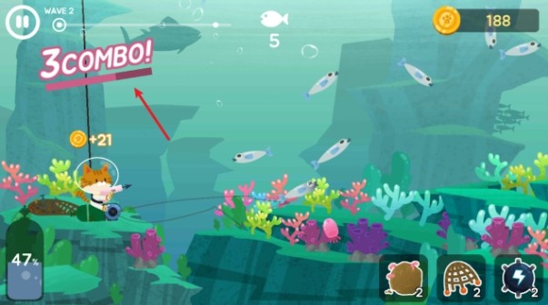 连续命中鱼群可触发连击效果,连击数达到10次以上,还能获得50%的能力加成,大幅提升捕鱼效率。