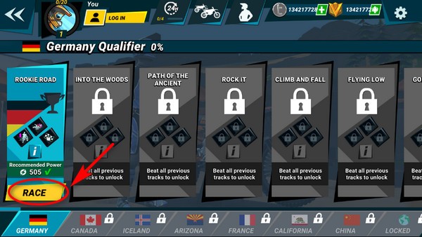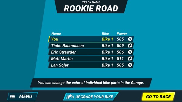 进入游戏主界面后,点击右下角黄色按钮即可开始比赛。随后选择心仪赛道,点击RACE”匹配对手,系统将自动为你安排竞技场次。匹配完成后,点击GO TO RACE”即可进入赛道,开启你的越野狂飙之旅。