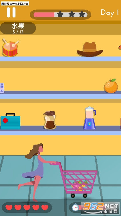 可爱漂亮的卡通游戏画面,虽然没有时间的限制,但是一旦货架的路程走完了,你还没有买到足够数量的物品,还是会闯关失败的