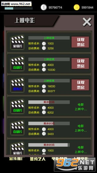 电影制片厂帝国(movie tycoon)刚开始的时候只有一个小小的工作室,但是通过拍摄电影获得收益之后,就能招募更多的明星和员工,去打造一个庞大的影视城;每个员工的属性都是可以培养的,选择最适合的类型,还能得到各种电影奖项的提名。