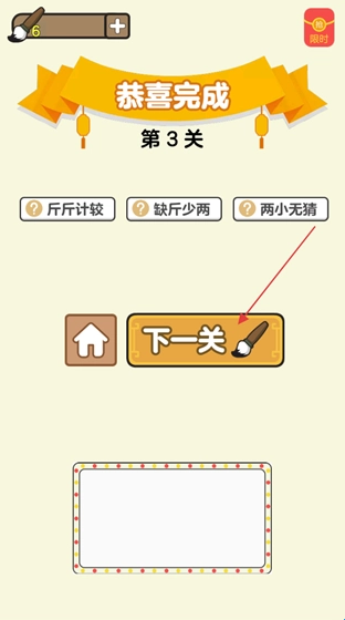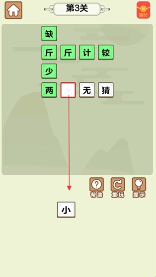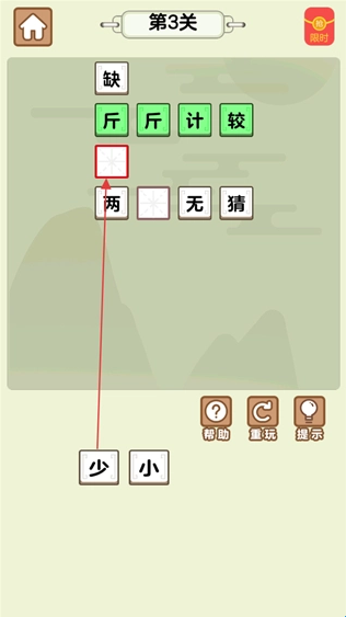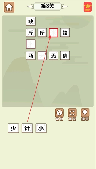 1、查看第3关界面,取下方计填入空格,组成斤斤计较。