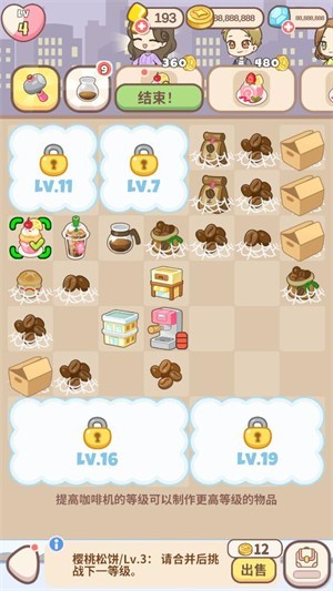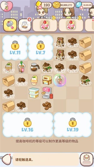 在合成界面中,点击咖啡机等设备可获得基础物品,将两个相同的物品拖动合并,即可合成更高级的道具。