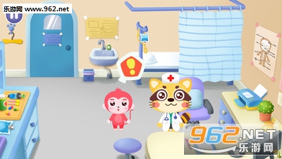 在游戏中,医生是只可爱的浣熊,所有医疗器械都是有趣的卡通形象,让宝宝慢慢在游戏的过程中增加对医院的认识。