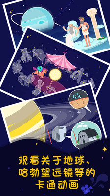 观看关于地球、哈勃望远镜等的卡通动画