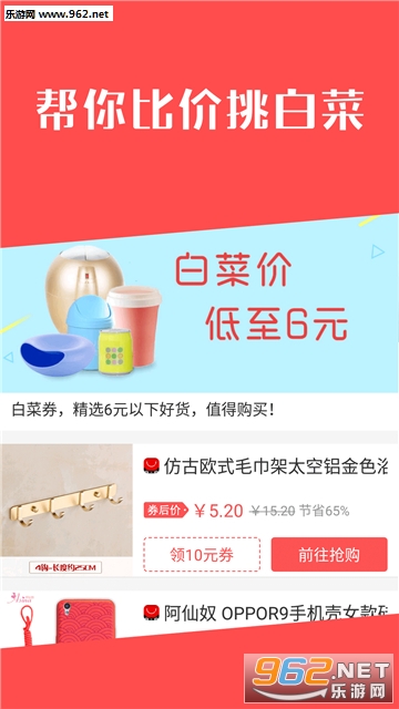3、帮你比价挑白菜:每天精选小于6块的超值商品,白菜券轻松领,剁手不花钱。