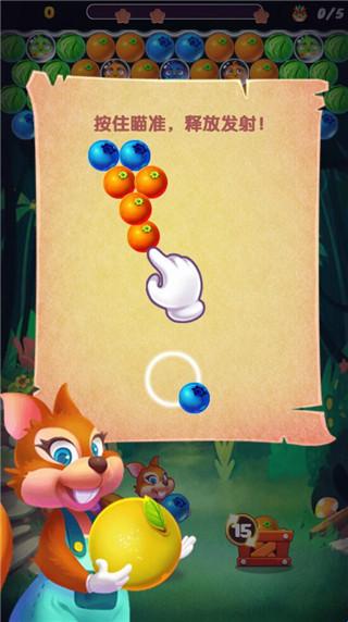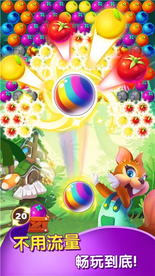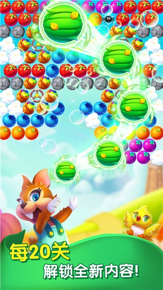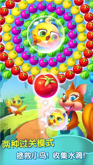 泡泡农场大作战是一款以经典泡泡龙玩法为核心的休闲益智手游,讲述了小松鼠拯救被魔法泡泡困住的小鸟、收集水滴浇灌农场的趣味故事。玩家通过瞄准发射、匹配消除同色泡泡完成关卡目标,核心玩法包含“拯救小鸟”与“收集水滴”两种模式。游戏设计了上百个递进式关卡,随着挑战深入,会出现石头、蜘蛛、云雾等障碍物增加难度,同时可借助炸弹、火箭等道具突破困境。