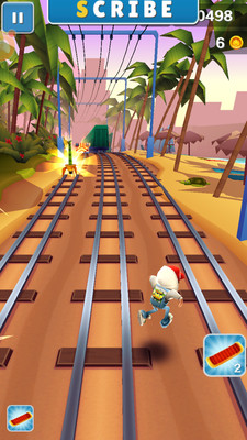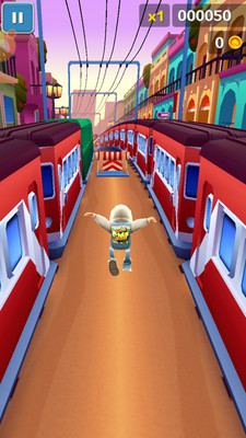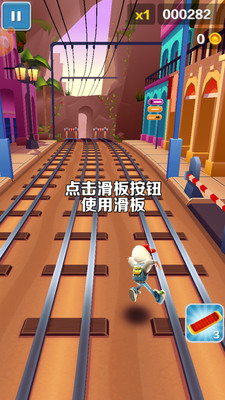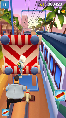 游戏操作全部用触摸手势完成,在屏幕上往上划是跳跃,往下划是翻滚,左右划是变换轨道。游戏中最主要的障碍物就是铁轨上的一截截列车车厢,以及那些横跨在铁轨上高高低低的挡板,利用角色敏捷的身手在这中间穿梭,流畅的动作和精细的画面都很能给人满足感。铁轨中分布着一颗颗金币,你可以把这些金币当做前进道路上的指引,朝着金币多的地方前进。