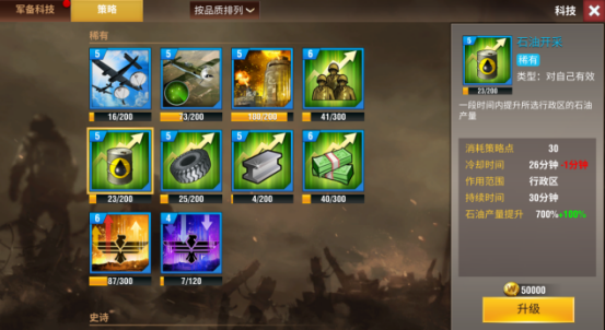 3、策略相对于科技来说优先级不高,所以平民玩家建议将资源集中放在科技上,若有富余可针对某些策略进行属性提升!!!