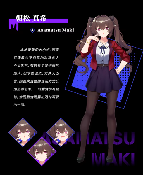 朝松真希 本地豪族大小姐,言辞直率甚至略显傲慢,实则内心温柔。对甜食毫无抵抗力,一提到蛋糕或布丁便会露出呆萌神情,反差感十足。