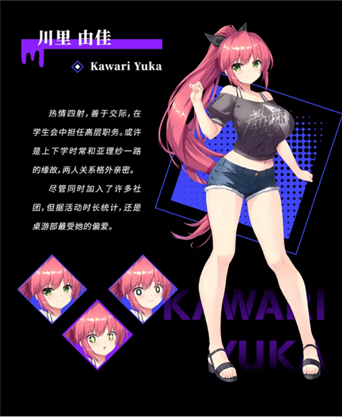 川里由佳 学生会高层,热情开朗,社交能力极强。虽加入多个社团,却最常出现在桌游部。因与亚理纱上下学同行,两人关系格外亲密,是她少有的现实好友之一。
