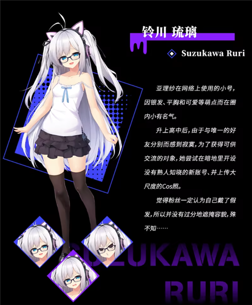 铃川琉璃 亚理纱的网络小号身份,凭借银发、平胸与可爱气质在圈内小有名气。升入高中后因与挚友分离感到孤独,遂开设新匿名账号上传大尺度Cos照,未刻意遮掩容貌,却不知早已被人盯上。