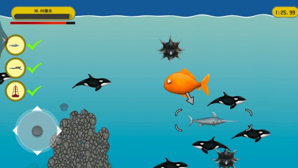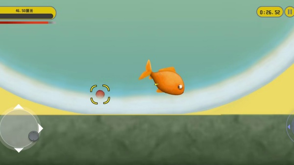 游戏采用虚拟摇杆或触控滑动控制角色移动,系统自动识别并吞噬体型小于你的生物,上手简单却极具操作流畅感。然而,海洋并非只有猎物——大型捕食者随时可能现身,一旦被攻击将损失生命值,归零即宣告游戏结束。