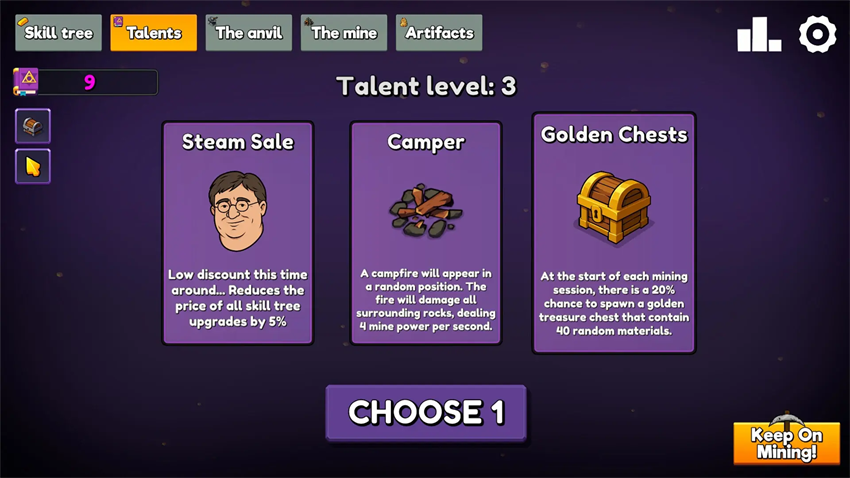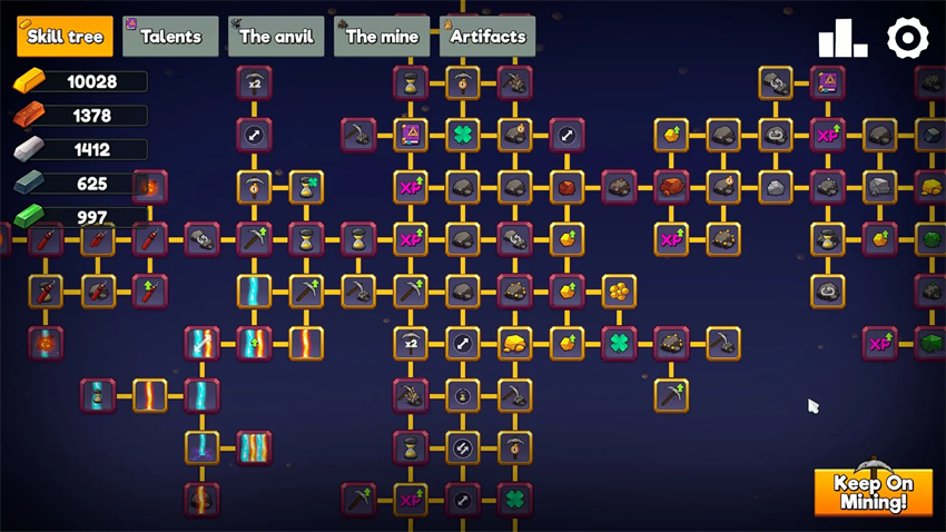 收集多样矿石材料,将其熔炼为锭,为后续发展奠定资源基础。通过技能树系统,消耗材料锭永久提升角色属性,让每一次挥镐都更加强力高效。利用不同材料锻造专属镐具,每把新镐都带来更快的开采速度与更高的破坏力。天赋卡机制则在每次升级时提供策略性选择,逐步构建个性化成长路径。而一旦解锁矿井,它将作为核心挂机系统,自动为你采集岩石并转化为锭,真正实现离线也能赚”!