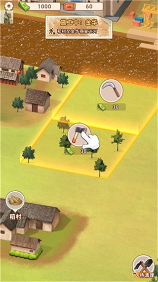 4、由于路不平,玩家需要清理路面的东西,点击斧头就可以清理树木,点击镰刀,就能够收取庄稼。