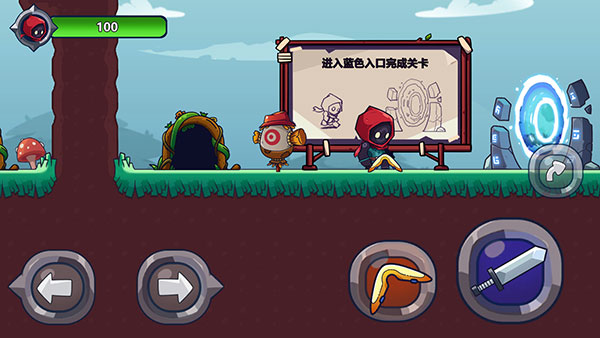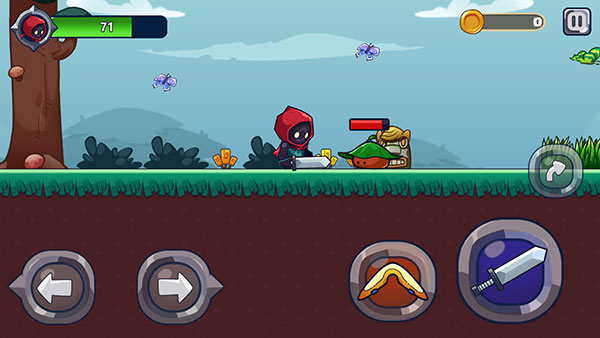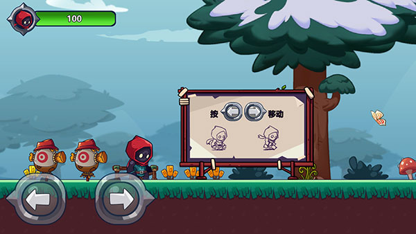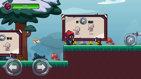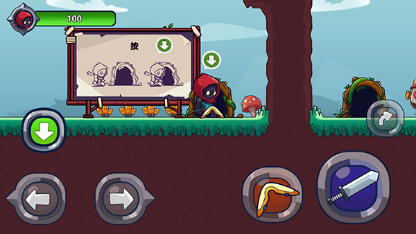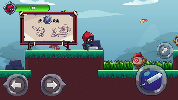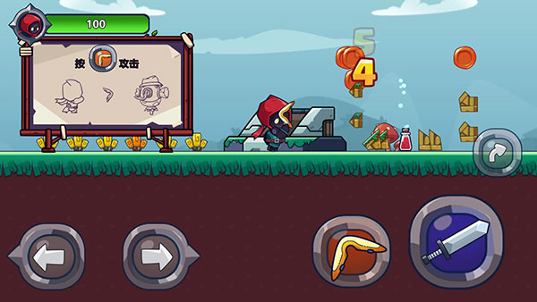 游戏采用直观的虚拟按键布局,左侧为方向控制键,精准操控角色移动;右侧中部设有跳跃键,助你灵活跃上平台(注意:不支持二段跳)。右下角配置近战攻击键,适合贴身输出,可先在训练稻草人上熟悉手感。