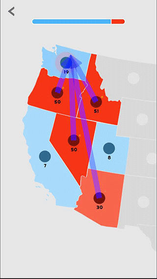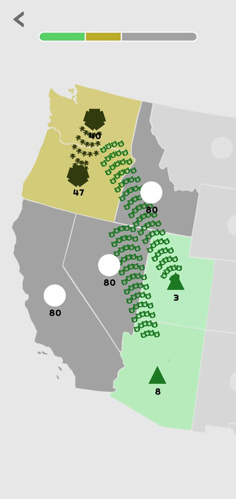 单位数量随时间自动增长,颜色深浅直观反映兵力强弱。点击并拖动己方区域的圆点,即可派遣部队进攻相邻地块。若我方兵力大于敌方,则成功占领并扣除相应数量;反之则可能失守。更高级的技巧包括多区域兵力集结、精准时机突袭,甚至利用空城计”诱敌深入——真正的纸上谈兵,尽在指尖。