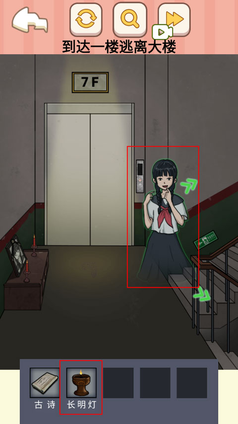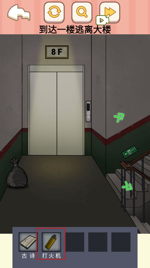 4、在8楼垃圾袋中找到打火机,用其点燃长明灯,并选择小女孩未被遮挡的楼梯方向前进。