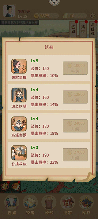 要想生活过得去不砍价怎么可以呢,这些技能就是与市民购买东西的砍价技能,虽然说砍得可能比较少,但是3级以后几乎可以砍下1000多钱呢,省下好多钱我们去买酒楼不香嘛!
