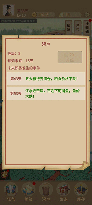 在预知这里我们可以看到最近即将发生的事务,就像粮食下跌,鱼价大跌等,这个时候我们就要等到这个日子来到的时候把粮仓和鱼仓全部关闭不对外售出,大量去市集购买这些物品,等到第二天在上架,这个时候我们就可以特别有利的将这些东西变废为宝!