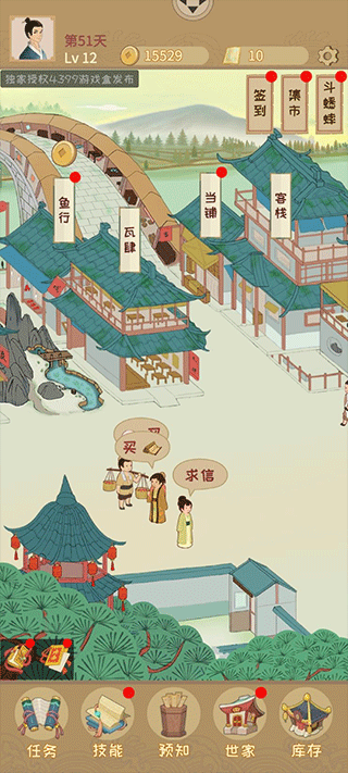 2、经营店铺:购买并经营多种店铺,店铺可升级、可招募掌柜和伙计,店铺种类包含商铺、酒肆、客栈、当铺、银号、船坞等。