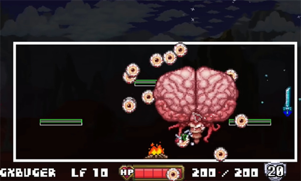 BOSS特性: - 克苏鲁之脑分为两个阶段:第一阶段本体无敌,周围环绕小怪;需先清除所有小怪方可进入第二阶段。 - 第二阶段中,Boss本体可被攻击,会高速移动并发动冲撞攻击。 - 若同时敲碎多颗血腥心脏,可召唤两只克苏鲁之脑,它们共享飞眼怪仆从,并同步进入第二阶段。 - 血量设定相对亲民:普通模式仅1000 HP,专家模式为1700 HP,考验的是操作而非持久战。