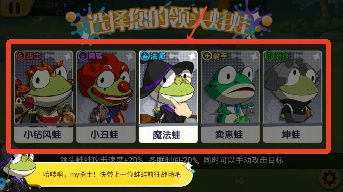 进入《精灵王国2026》,首先选择一只初始青蛙作为你的角色——每只都拥有独特属性与成长方向,奠定你的战斗风格基础。