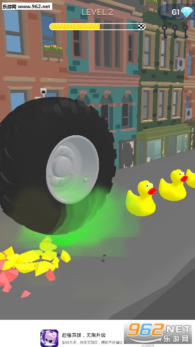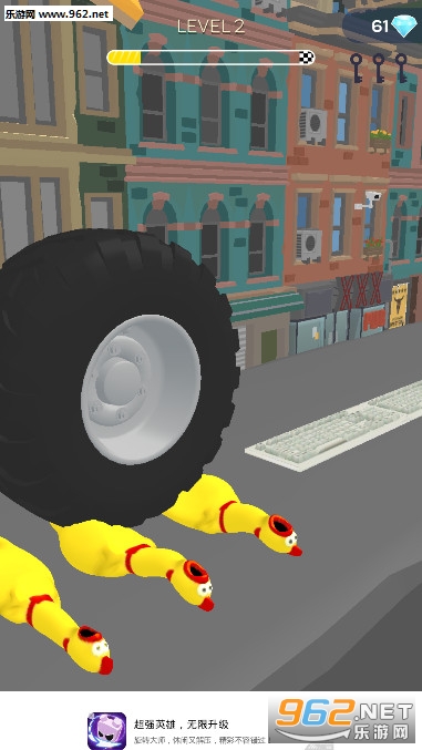 《尖叫鸡的报复小游戏》是一款休闲解压小游戏,游戏的玩法很简单,马路上会摆放会多的东西,气球,牙膏,尖叫鸡,小黄鸭,魔方等等,你要做的就是滚动轮胎,让轮胎从这些物品身上碾压过去,将物品挤压爆浆,一直滚到终点就好,还会有很多的轮胎皮肤可以解锁。