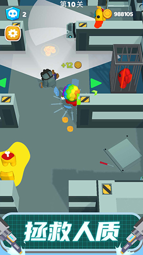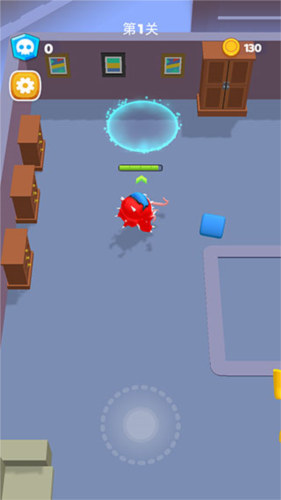 注意:地图中除你之外的所有角色均为敌人,左上角蓝色数字实时显示剩余敌人数。每个敌人都有锥形视野范围,一旦踏入即触发警报并引来围攻。因此,隐蔽行动是关键——若不慎暴露,只能正面硬刚。清除所有敌人后,出口(蓝色圆圈)将开启,踏入其中即可触发炫酷传送特效,完成关卡。