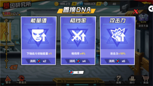 基因研究所采用爬塔式闯关设计,玩家需逐层击败各路怪人。每次挑战前可选择难度,首次通关困难模式可获双倍奖励。战斗胜利后将获得DNA资源,用于开启基因方盒——内含钻石、升星卡等稀有道具。途中还可遭遇DNA增强装置,消耗DNA换取临时战力加成,甚至召唤强力助战角色。此外,研究所内藏有保险箱,开启后可获得额外物资。需注意的是,战斗采用血量继承机制,合理规划队伍续航至关重要。