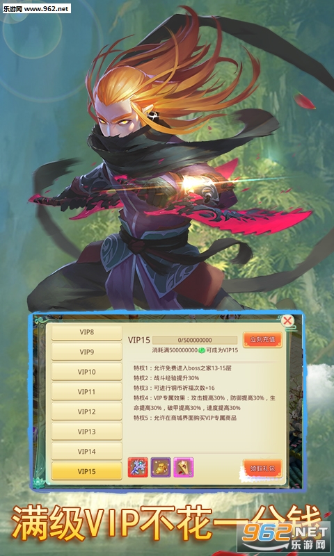 ★满VIP,登录就送V15 登录游戏,立即赠送永久VIP15的最高特权,不花钱也能当土豪
