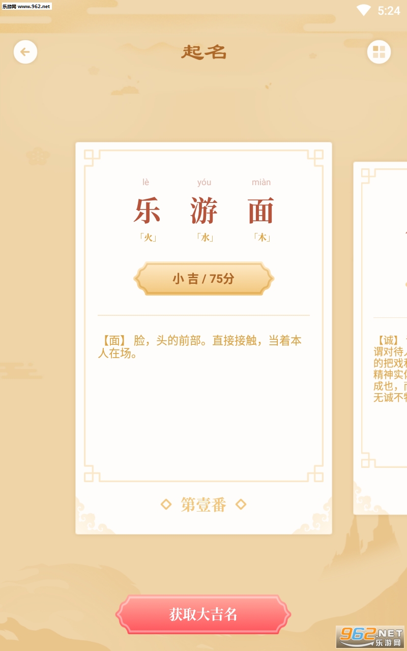 2、滑动选名:筛选出的名字签牌以滑动方式呈现,左右滑动选择心仪的名字。还可解锁优质高分大吉名。