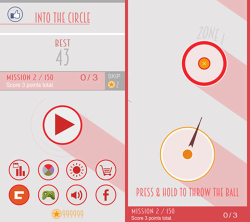 在《走进圈子里》中,你将操控一颗内置指针的小球。指针会持续左右摆动,点击屏幕即可锁定当前方向;随后通过按住屏幕的时间长短,决定小球发射的力度(即高度)。目标是让小球最终停落在目标圆圈内部——若恰好命中圆心,不仅能获得Perfect”评价,还能赢取额外分数奖励。一旦力度过大或过小导致小球落出圈外,游戏即告结束,但可使用星星道具续命继续挑战。
