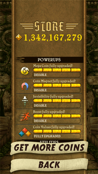 吃到金币后能量槽会增加,增满后会成荧光绿状态,这个时候双击屏幕任何位置就能使用特殊能力。能力会有多种选择,在此特别推荐使用如图所示的吸收金币的能力。获得条件貌似是达到多少级,反正挺简单的,完成成就就能获得经验升级,当然他的成就是英文描述,请查看《神庙逃亡》人物技能介绍。大概就是上面这些技巧了,别看贴吧论坛什么的到处都是天大的数字,其中很大一部分都是靠修改器刷出来的,如果光凭自身技巧,那才是值得称赞。对了,之前我发了两篇文章就重点教大家怎么无限刷金币和无限刷钻石哟。