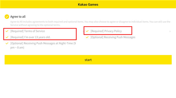 2、进入后是权限服务选择,显示了【Required】的也就是红框中的都是必填选项,分别是游戏须知、年龄和服务条款,其他两个分别是消息推送和游戏通知,选择好后就可以进入游戏开始体验。