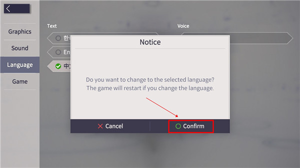 5、在弹出来的页面中选择下方的确认,等待游戏重启即可完成设置。