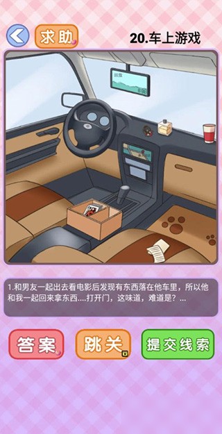 第20关:题目为和男友一起出去看电影后发现有东西落在他车里,所以他和我一起回来拿东西...打开门,这味道,难道是?” 正确操作:依次点击车上的香水、杂物箱里的扑克牌、香水旁的头绳、行车记录仪。