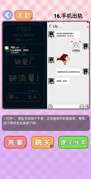第16关:题目为叮咚~,男友手机响个不停,正准备将手机拿给他,等等,这个称呼也太亲密了吧!” 正确操作:依次点击左边的亲爱的,在吗”、右边的宝宝要亲亲”表情、右侧左侧的头像、老婆喜欢的老公必须买买买!!!”。