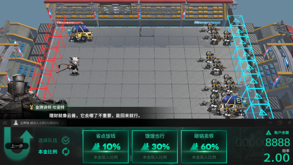 游戏以资源分配+自动战斗”为核心机制。每轮对战开始前,系统会为双方分配固定的出击总费用”和可出战兵种数量。玩家需从所有可用干员中挑选指定数量的单位,并将总费用合理分配至各兵种——为避免极端分配,系统会将费用平均分为兵种数+1”份,其中一份均分后随机追加,确保各单位战力相对均衡。确认配置后,战斗自动展开,胜负不仅取决于干员强度,更考验阵容搭配与属性克制的深度理解。