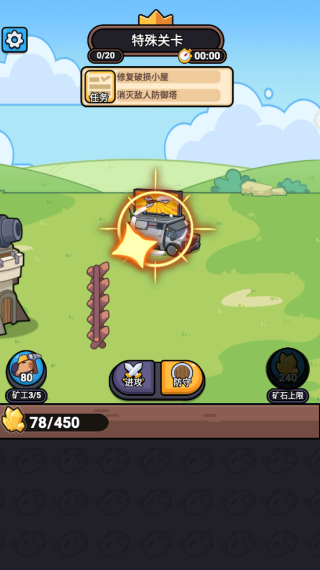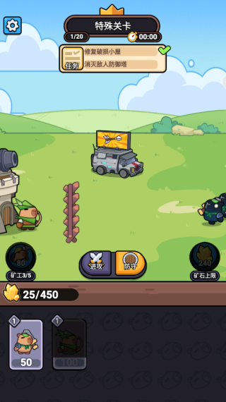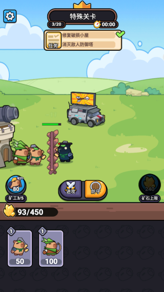游戏初期,你将通过收集矿石来召唤基础卡皮巴拉单位,完成关卡任务。随着进度推进,修复小屋可解锁新角色(如弓箭巴拉),进一步拓展战术选择。通过不断召唤、升级兵种,你的军团战斗力将持续提升,从而挑战更高难度的任务与敌人。每一次胜利都意味着更强的卡皮巴拉军团正在成型。
