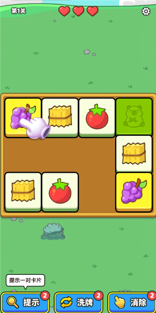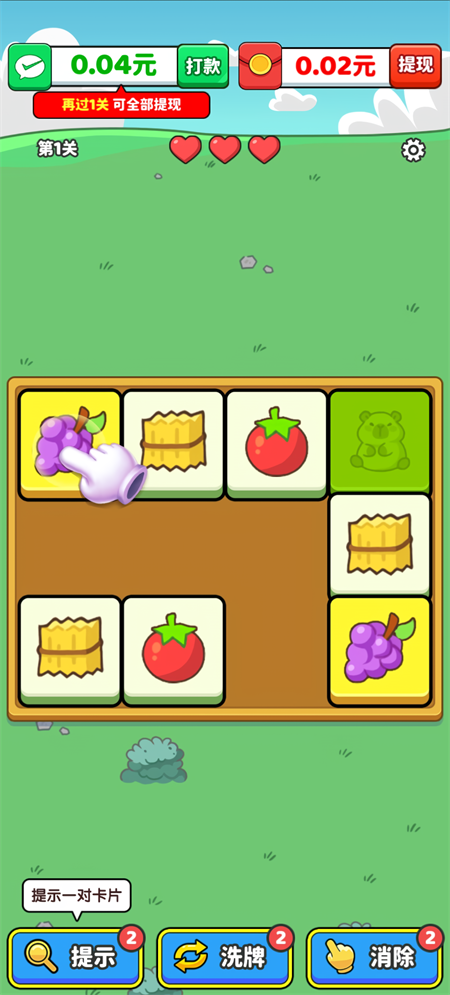 首次进入游戏后,跟随引导点击相同图案的卡牌进行连线消除即可。若遇到卡关,不妨使用提示”洗牌”或消除”道具辅助通关。注意每局仅有三条生命,错误操作会扣除一次,耗尽则需重新开始。成功通关后,红包奖励将自动计入账户。