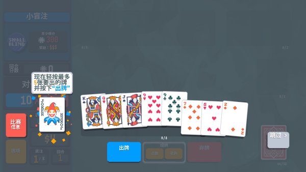进入游戏后,你的首要目标是赚取300筹码以击败小盲注。通过打出符合规则的扑克牌型(如对子、顺子、同花等),即可获得基础筹码,并乘以当前倍率结算。每回合你有固定次数的出牌与弃牌机会,合理利用这些操作,最大化单轮收益,是取胜的关键。